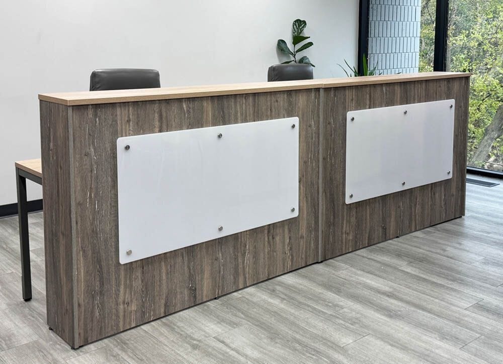 | Y14321 Same features as Y14320 reception station above but in larger size. Features a two-tone laminate blend of Driftwood and Barn Oak. Perfect for reception areas that need to balance style, practicality, and everyday performance, the Contrasts Rustic line makes a statement from the moment your guests walk in. Package includes two Y14312 71" Contrasts Reception Desks. Files sold separately.