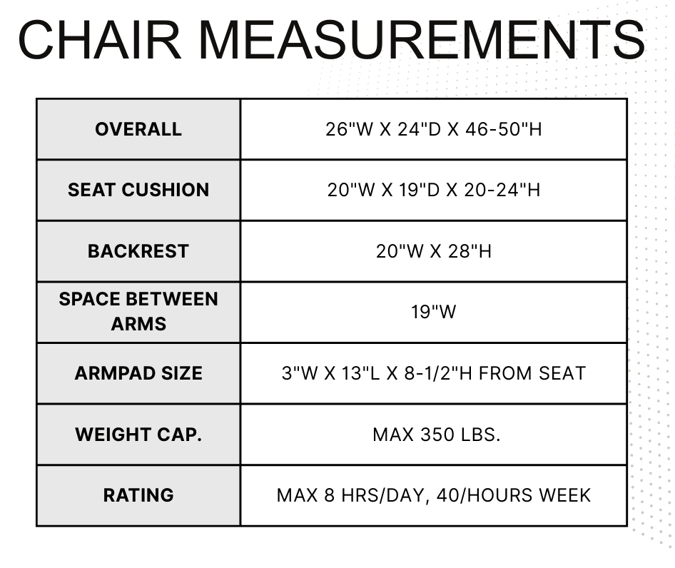 Measures 26"W x 24"D x 46 - 50"H overall. Seat measures 20"W x 19"D. See more measurements below. Shpg. wt. 43 lbs. This chair is rated for users up to 350 lbs. All components exceed ANSI/BIFMA commercial use requirements. Meets CA fire foam approval. 5-Year Limited Warranty. Ships unassembled. PRICE INCLUDES SHIPPING!