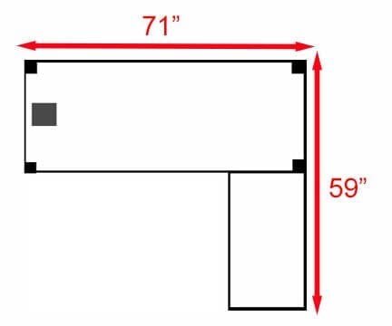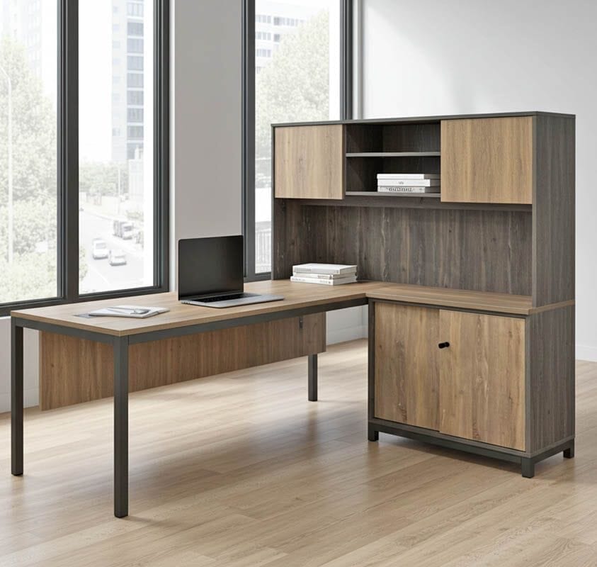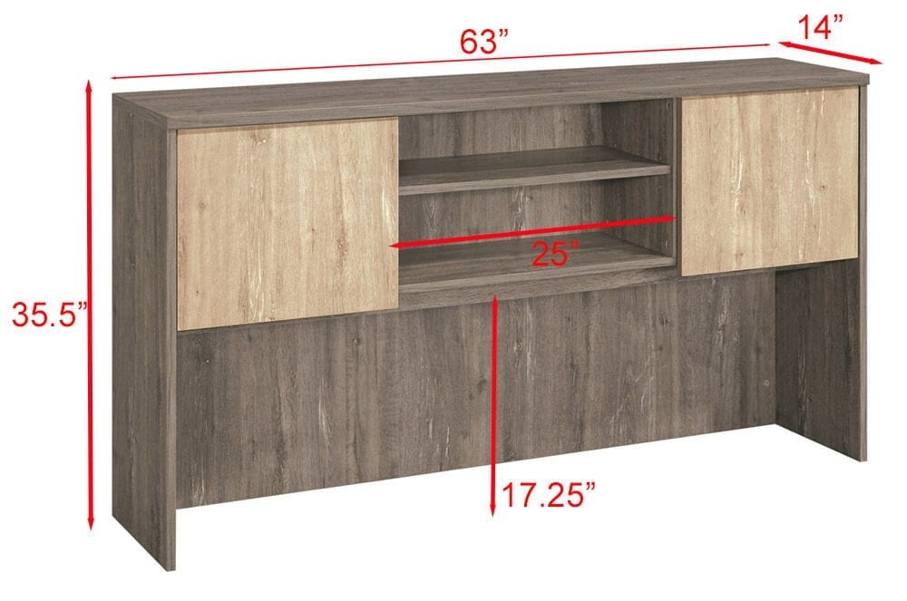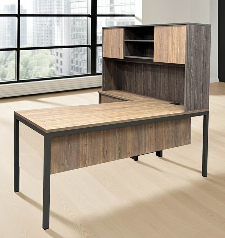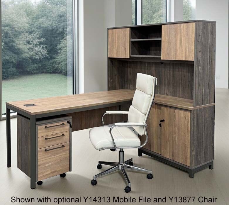 Just like the desks sold above but with a larger desk surface. The Contrasts Rustic 71"W L-Shaped Desk delivers simple, rustic style with convenient storage. The desk features a Barn Oak laminate worksurface and supported by a sturdy taupe-finished metal frame. A spacious sliding-door cabinet return extends your work area while keeping everyday essentials neatly tucked away. Above, the matching hutch adds vertical storage without taking up extra floor space, offering open cubbies and concealed areas to keep your desk organized and clutter-free. Includes one Y14343, 71"W Table Desk, one Y14316, 32"W Sliding Door Cabinet and one Y14324, 59"W Storage Hutch. Files sold separately. Cabinet can be used on the left or right side. Measures 71"W x 59-1/2"D x 29-1/2"H to the desktop. Hutch measures 29-1/2"H. Ships unassembled. Shipping weight 313 lbs. PRICE INCLUDES SHIPPING! (Truck shipment - see Terms & Conditions.) IN STOCK!