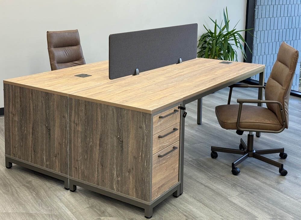 | Y14360 Just like the benching workstation sold above but with a larger worksurface. Each Barn Oak laminate desktop rests on a sturdy taupe-finished metal frame, creating a clean, streamlined silhouette that blends industrial durability with the warmth of natural wood tones.The fabric divider provides comfortable separation without interrupting the visual flow, maintaining an open, collaborative feel. And as your organization expands, the system expands with you - add additional desks to create a 4-person or 6-person workstation in minutes. Set includes two Y14343, 71"W Table Deskstwo Y14349 Freestanding Pedestals and one Y14347 Desk Mounted Partition. The 71"W Desk and 15"W File cabinet create a 86"W worksurface when used next to each other. Overall, this workstation measures 86"W x 54"D x 29-1/2"H to the desktop. Fabric partition is 15-1/2"H. Ships unassembled. Shipping weight 376 lbs. PRICE INCLUDES SHIPPING! (Truck shipment - see Terms & Conditions.) IN STOCK! |