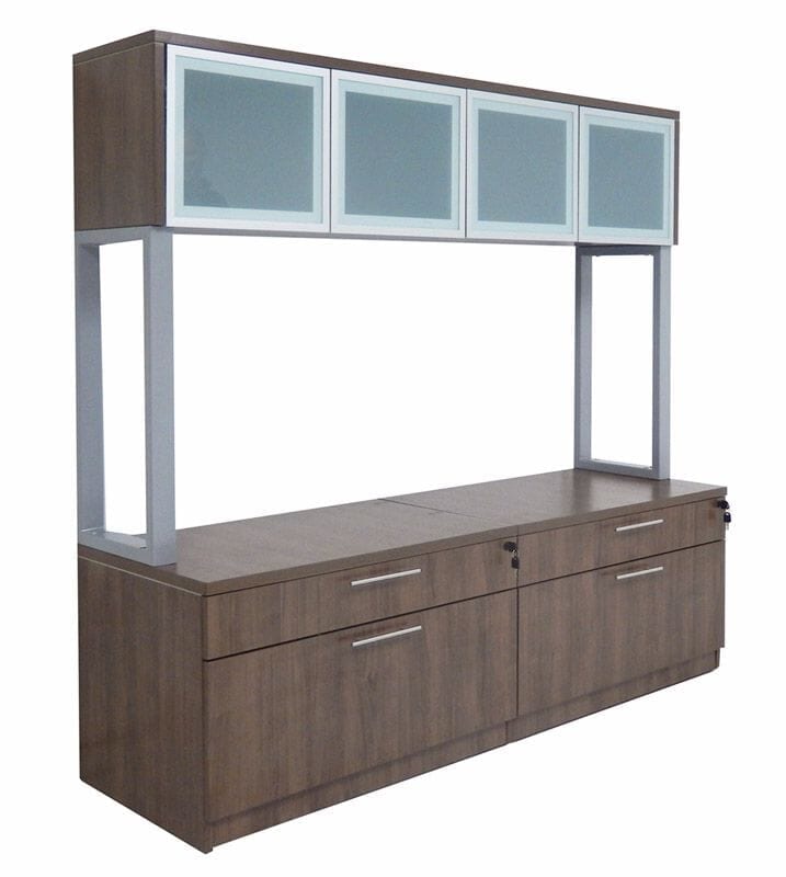 Fits neatly on 4-Door Storage Credenza or two Lateral Files for attractive additional storage space. Frosted glass doors hinge on fully adjustable hardware. Grommet hole in back panel as well as cord access along length of back. Cherry hutch has solid laminate doors in place of glass doors. Measures 71"W x 15"D x 36-1/2"H overall. 19" clearance under doors. Ships unassembled. Shipping weight 163 lbs. PRICE INCLUDES SHIPPING! (Truck shipment - see Terms & Conditions). IN STOCK!