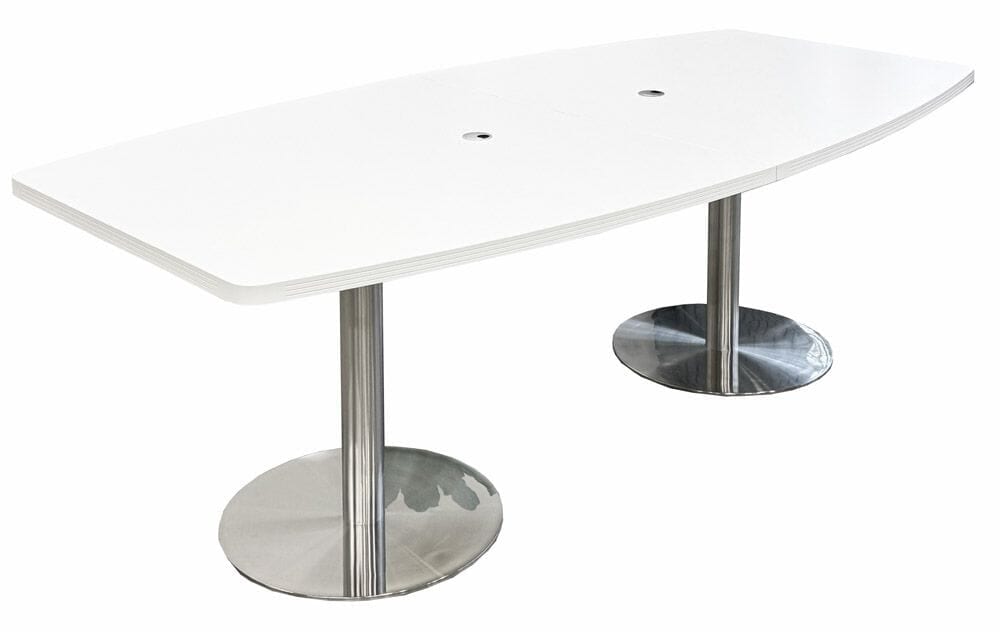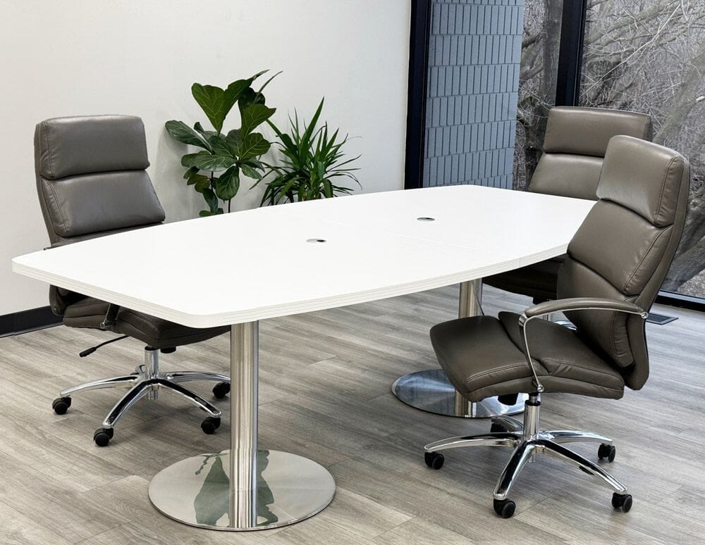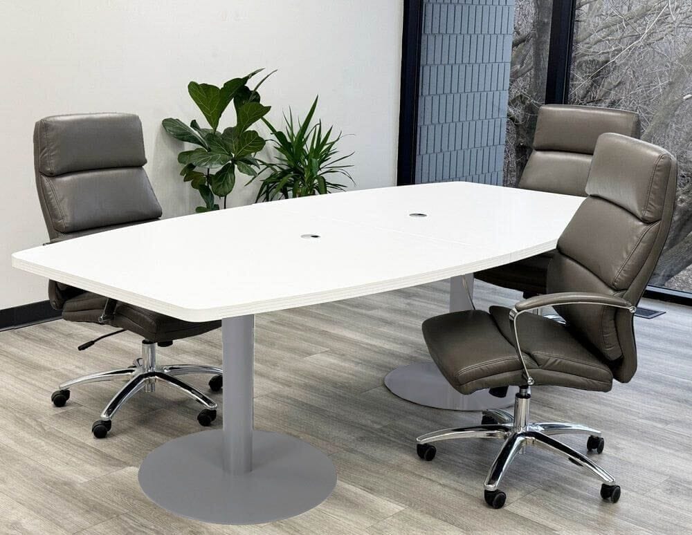Enhance your conference room's aesthetics and functionality with the Modern Office Boat Shape Conference Table. Enjoy unobstructed leg room, thanks to the sturdy single column disc bases. Available in multiple colors and sizes, this table is designed to seamlessly integrate into your workspace while catering to your specific needs.