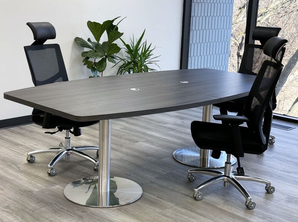 8' x 4' Boat Shaped Table with Steel Disc Bases sold above. See other sizes below.Crafted for both style and durability, the table boasts an impressive 1-1/2" thick tabletop in your choice of two modern laminate finishes: Charcoal or Modern Walnut. Each finish is complemented by matching fluted PVC edges, adding a touch of sophistication to the overall design. The sturdy construction is anchored by heavy-duty, weighted disc bases, ensuring a solid and stable foundation for even the most important meetings.