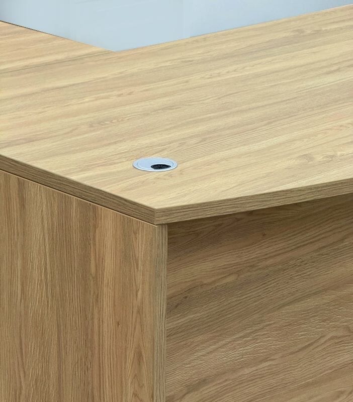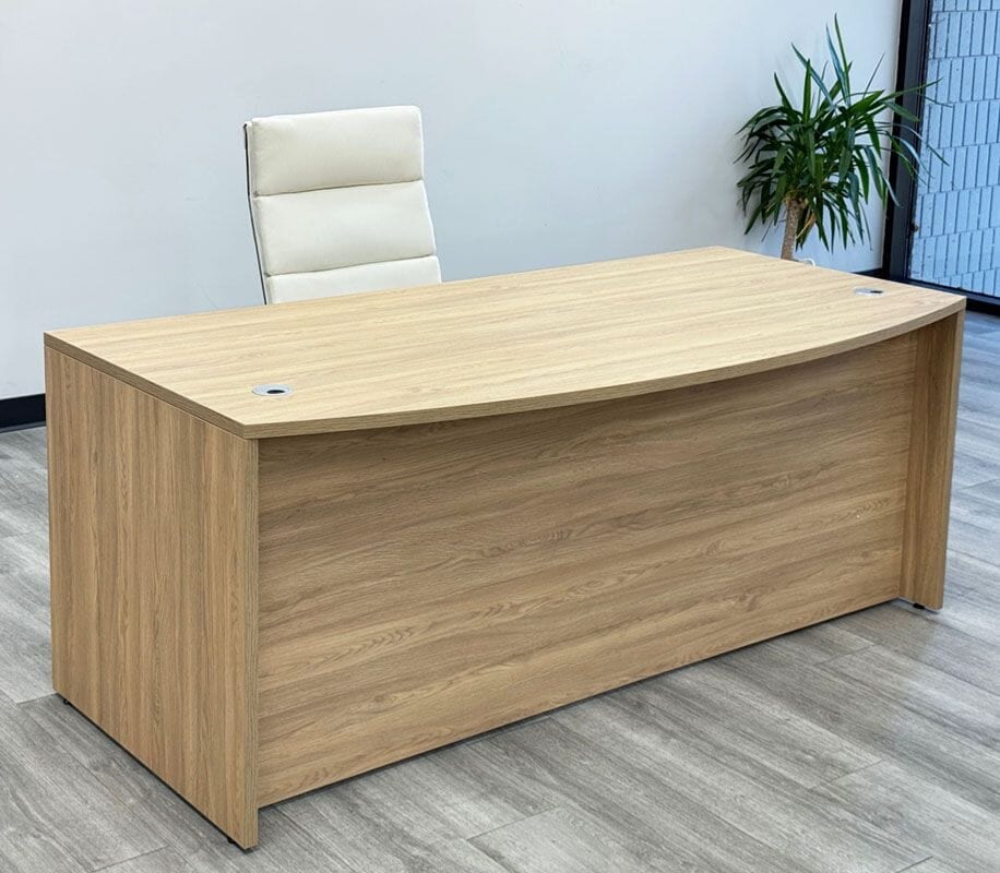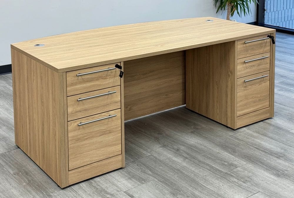 Constructed of a natural textured laminate finish, "Beaumont Oak", which looks and feels like real wood veneer. Bow front desk includes two silver grommets for wire access. Includes two locking box/box/file pedestals which feature soft-close drawers and a set of two keys each. Bow front desk measures 71"W x 35-1/2"D x 29-1/2"H. Ships unassembled. Shpg. weight 296 lbs. PRICE INCLUDES SHIPPING! (Truck shipment - see Terms & Conditions). IN STOCK!