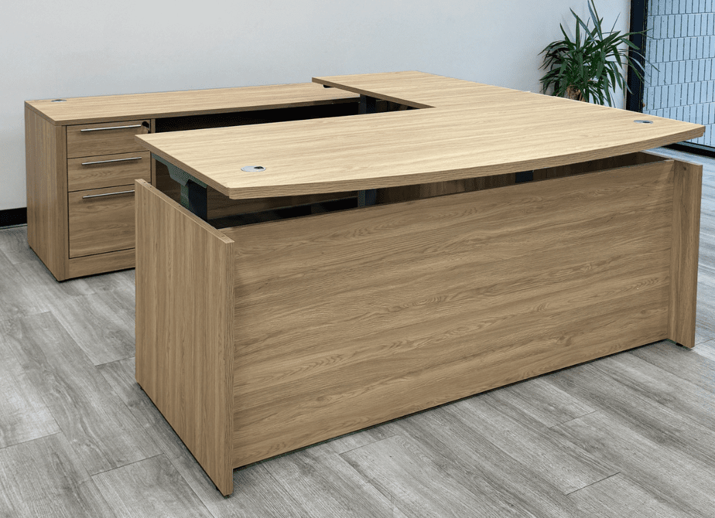 Just like the workstation sold above but without a hutch. 3-Leg electric lift frame lifts the front desk and bridge in unison, 30" - 50"H. Natural laminate finish, "Beaumont Oak", is textured and feels like real wood veneer. Measures 71"W x 100-1/2"D overall. Set includes a 3-leg electric lift frame in silver, 71" Bow Front Conference Desk, 41" Reversible Bridge, 71" Credenza and one locking box/box/file pedestal. Matching pieces sold separately below. Ships unassembled. Shpg. weight 521 lbs. PRICE INCLUDES SHIPPING! (Truck shipment - see Terms & Conditions). IN STOCK!