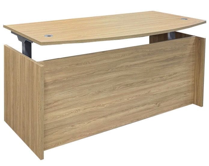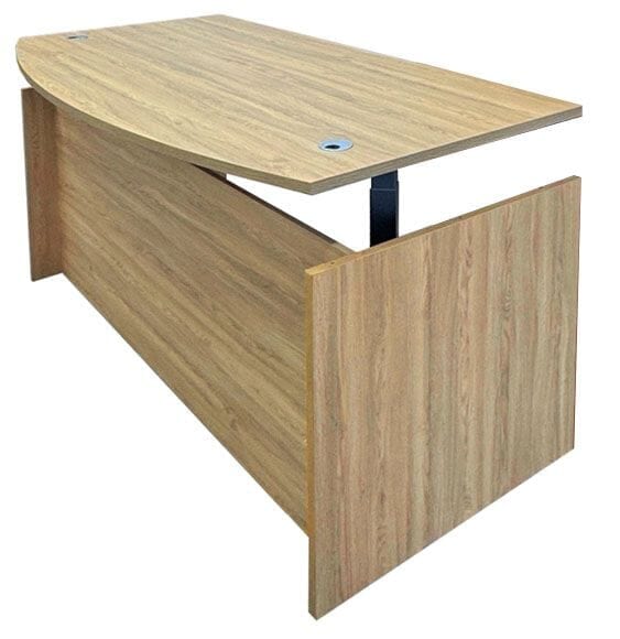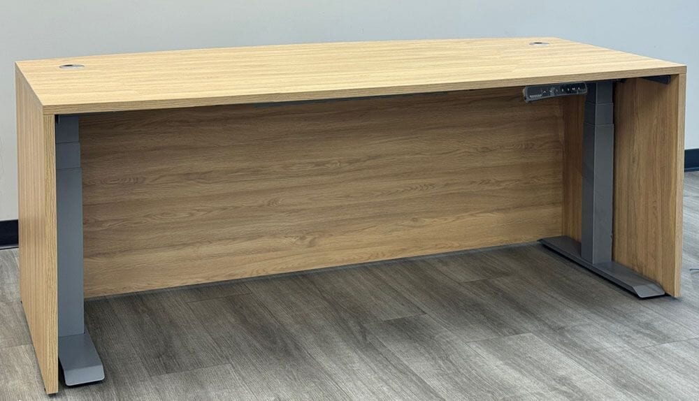 Constructed of a natural textured laminate finish, "Beaumont Oak", which looks and feels like real wood veneer. 2-Leg silver electric lift frame lifts the desktop 30" - 50"H. Bow front desk includes two silver grommets for wire access. Measures 71"W x 35-1/2"D x 29-1/2"H. Ships unassembled. Shpg. weight 254 lbs. PRICE INCLUDES SHIPPING! (Truck shipment - see Terms & Conditions). IN STOCK!