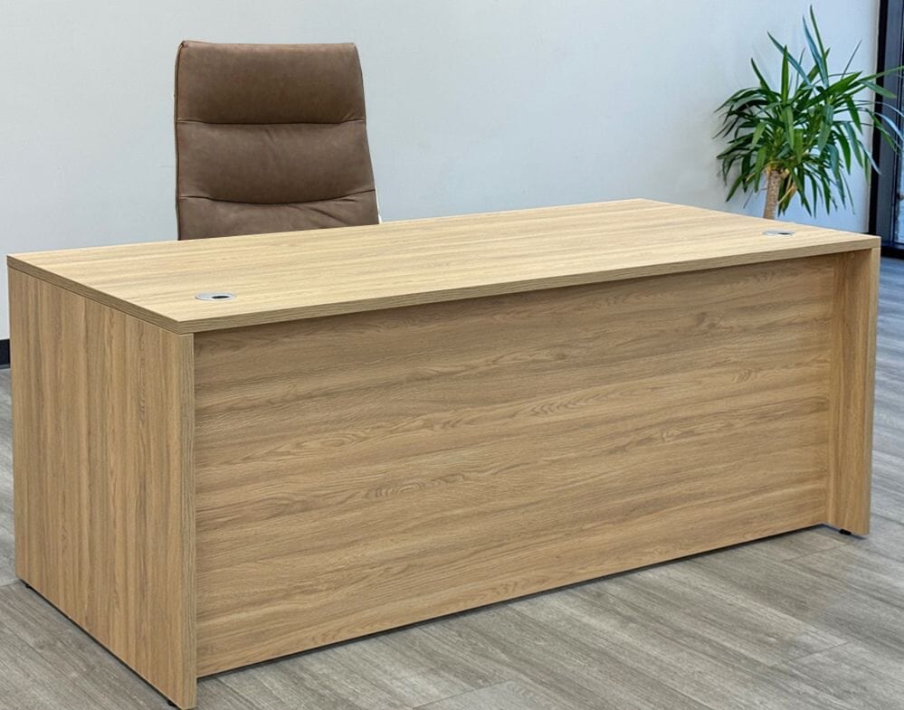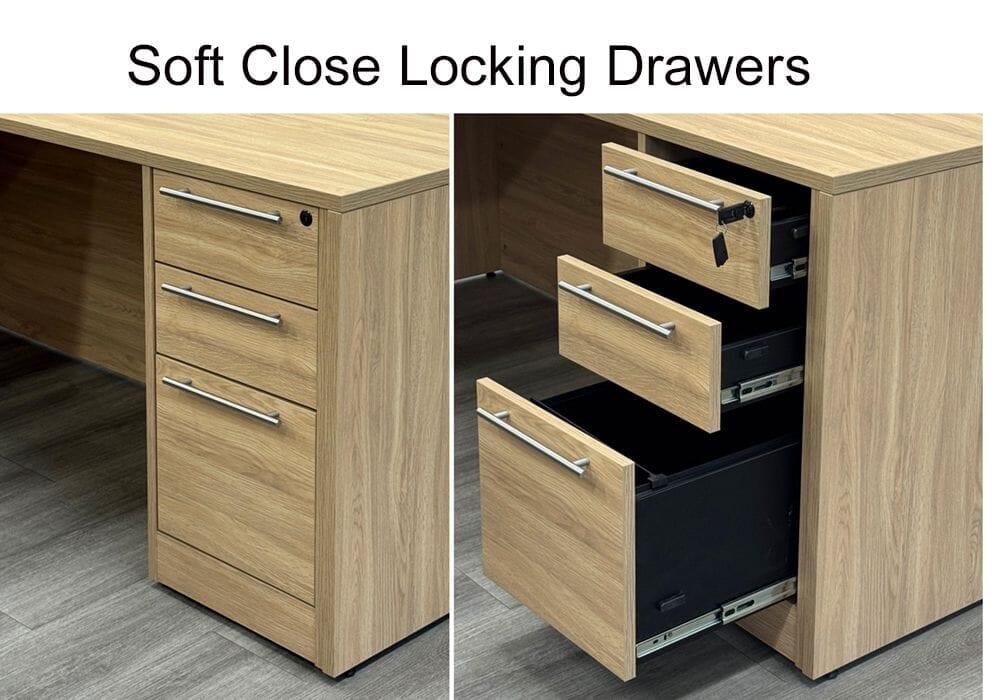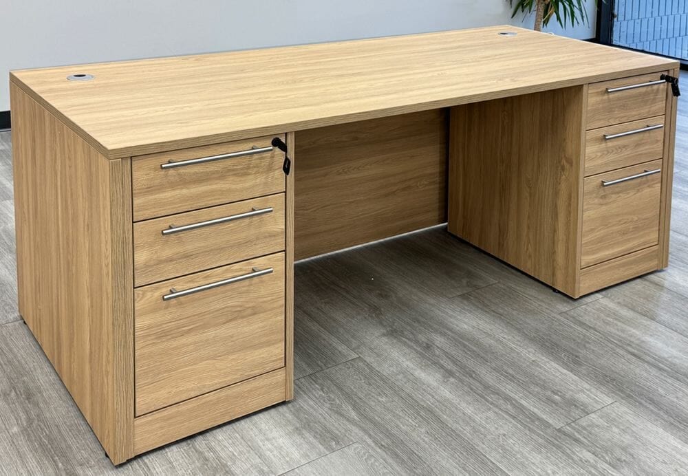 Just like the desk above but with a straight front desk.Constructed of a natural textured laminate finish, "Beaumont Oak", which looks and feels like real wood veneer. Executive desk includes two silver grommets for wire access. Includes two locking box/box/file pedestals which feature soft-close drawers and a set of two keys each. Measures 71"W x 29-1/2"D x 29-1/2"H. Ships unassembled. Shpg. weight 281 lbs. PRICE INCLUDES SHIPPING! (Truck shipment - see Terms & Conditions). IN STOCK!