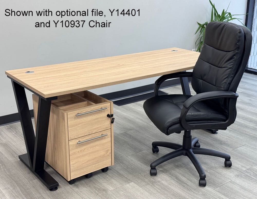 Desktop features a natural laminate finish, "Beaumont Oak", that is textured and feels like real wood veneer. Black steel V-shaped desk legs. Two built-in grommets for wire management. Measures 71"W x 29-1/2"D overall. Files and matching pieces sold separately below. Ships unassembled. Shpg. weight 96 lbs. PRICE INCLUDES SHIPPING! (Truck shipment - see Terms & Conditions). IN STOCK!
