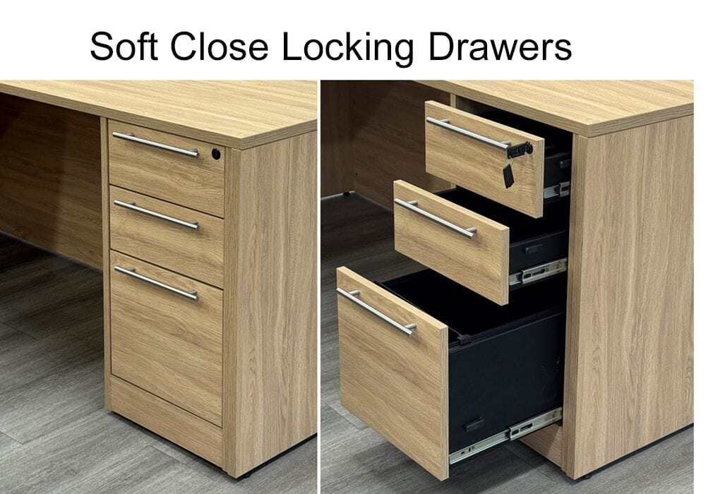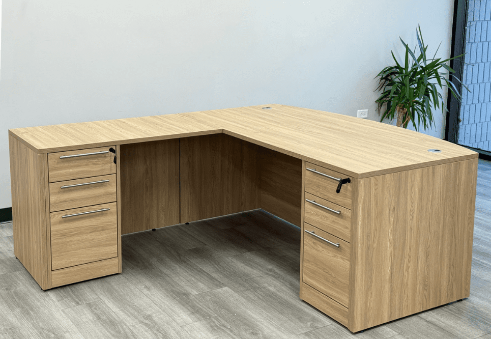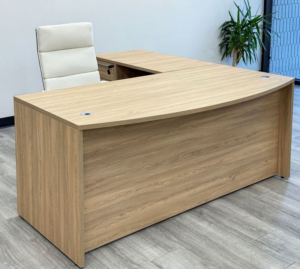 Constructed of a natural textured laminate finish, "Beaumont Oak", which looks and feels like real wood veneer. Reversible return desk can be set up on the left or right. Bow front desk includes two silver grommets for wire access. Includes two locking box/box/file pedestals which feature soft-close drawers and a set of two keys each. Bow front desk measures 71"W x 35-1/2"D x 29-1/2"H. Reversible return measures 41-1/4"W x 23-1/2"D. L-desk measures 71"W x 76-3/4"D overall. Ships unassembled. Shpg. weight 373 lbs. PRICE INCLUDES SHIPPING! (Truck shipment - see Terms & Conditions). IN STOCK!