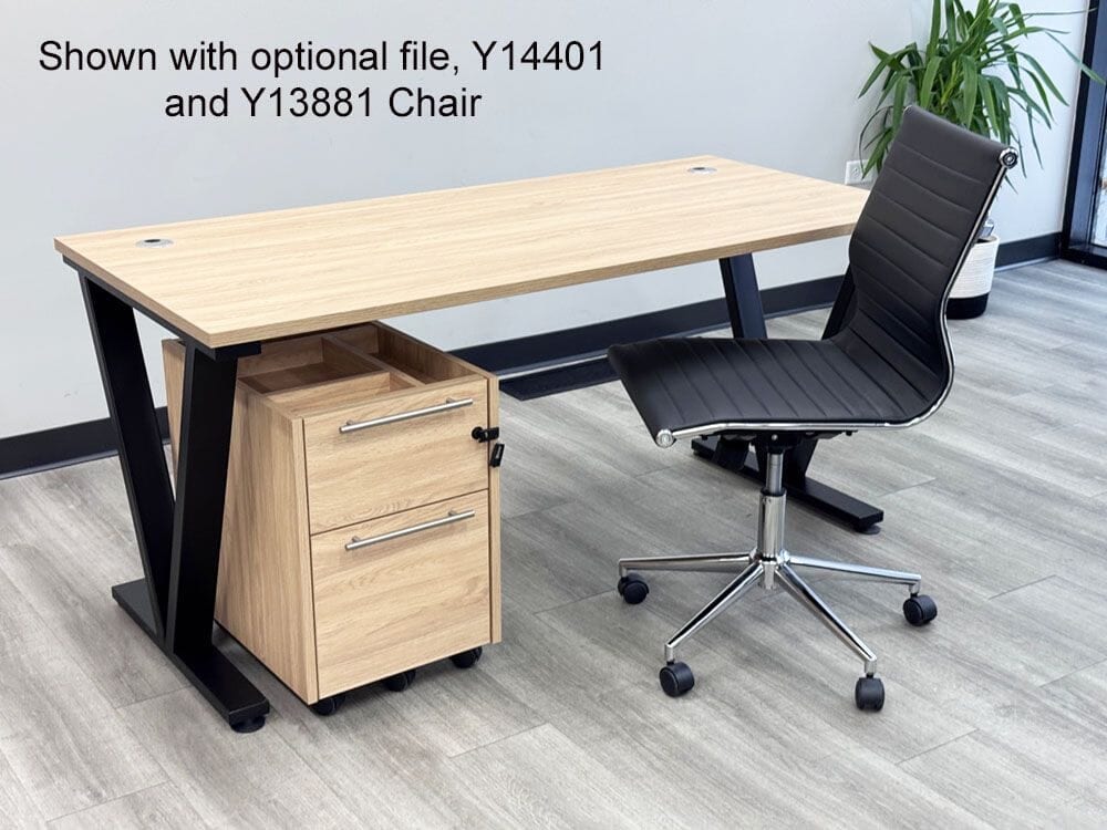 Desktop features a natural laminate finish, "Beaumont Oak", that is textured and feels like real wood veneer. Black steel V-shaped desk legs. Two built-in grommets for wire management. Measures 63"W x 29"D overall. Files and matching pieces sold separately below. Ships unassembled. Shpg. weight 88 lbs. PRICE INCLUDES SHIPPING! (Truck shipment - see Terms & Conditions). IN STOCK!