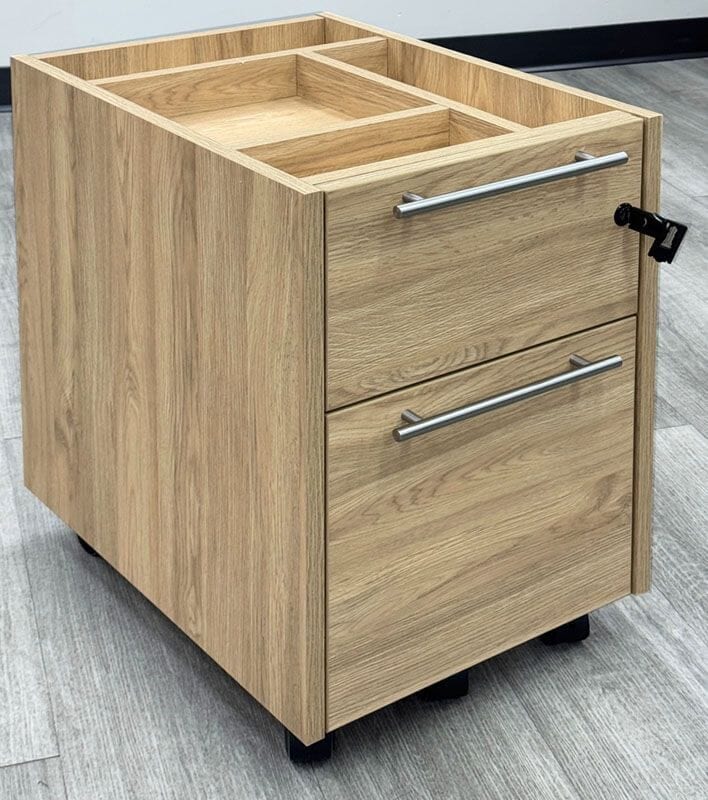 Convenient mobile file offers on-the-go storage inside and out. Easily rolls on 5 casters and tucks neatly under any desk. Constructed of a natural textured laminate finish, "Beaumont Oak", which looks and feels like real wood veneer. Top of file includes an organizer for office supplies. Lower drawer accepts letter and legal size file folders. Includes a set of two keys. Cabinet measures 16"W x 21"D x 23"H. Ships assembled, just attach the casters. Shpg. weight 64 lbs. PRICE INCLUDES SHIPPING! (Truck shipment - see Terms & Conditions). IN STOCK!
