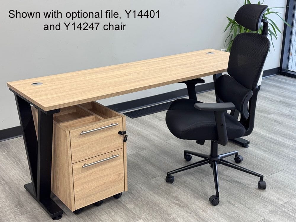 Desktop features a natural laminate finish, "Beaumont Oak", that is textured and feels like real wood veneer. Black steel V-shaped desk legs. Two built-in grommets for wire management. Measures 71"W x 24"D overall. Files and matching pieces sold separately below. Ships unassembled. Shpg. weight 80 lbs. PRICE INCLUDES SHIPPING! (Truck shipment - see Terms & Conditions). IN STOCK!