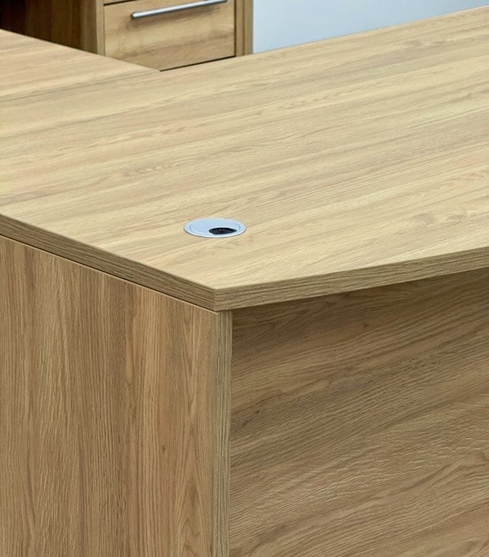 | Y14384 A smaller version of the desk above.Constructed of a natural textured laminate finish, "Beaumont Oak", which looks and feels like real wood veneer. Managers desk includes two silver grommets for wire access. Includes two locking box/box/file pedestals which feature soft-close drawers and a set of two keys each. Measures 63"W x 29-1/2"D x 29-1/2"H. Ships unassembled. Shpg. weight 271 lbs. PRICE INCLUDES SHIPPING! (Truck shipment - see Terms & Conditions). IN STOCK! |