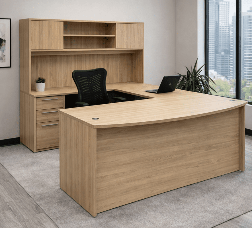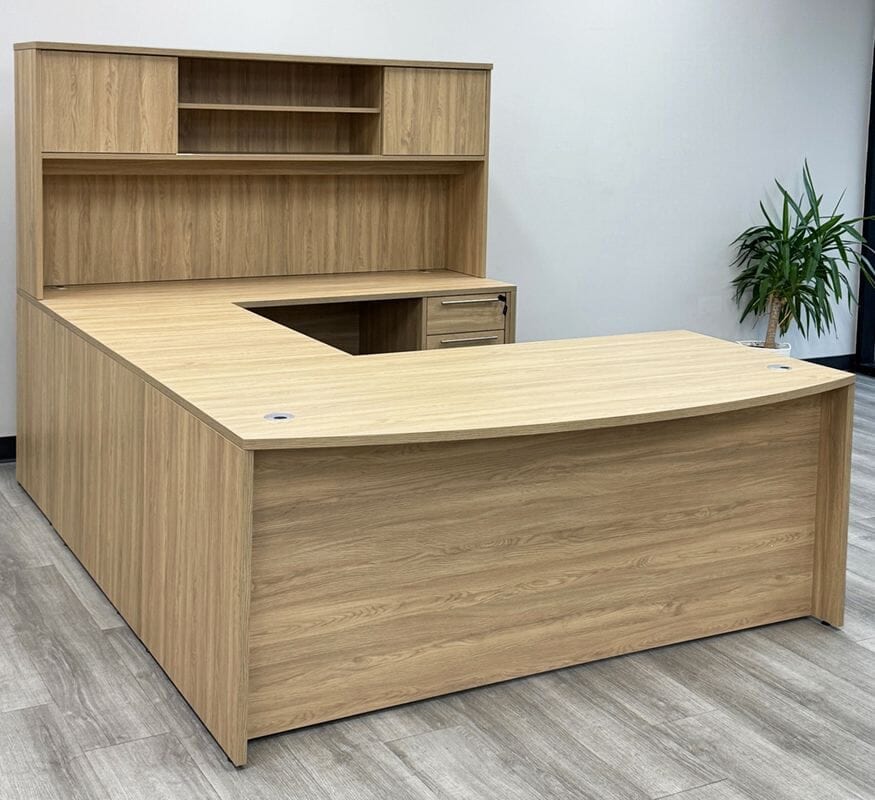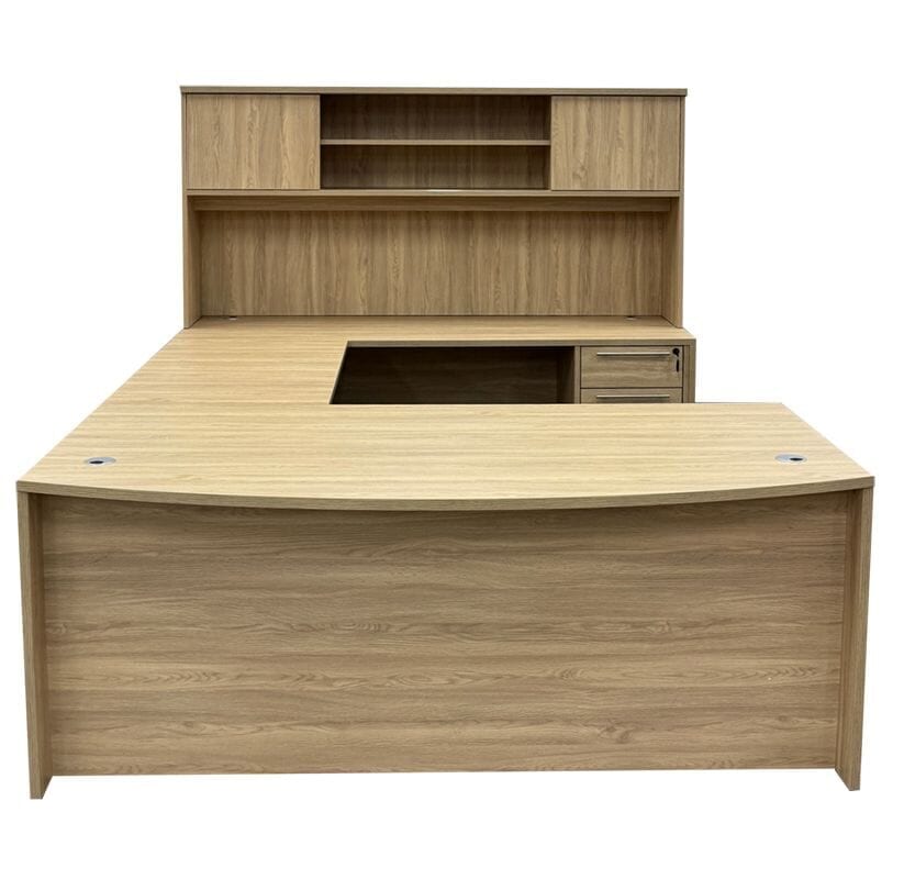 | Y14382 Constructed of a natural textured laminate finish, "Beaumont Oak", which looks and feels like real wood veneer. Bow front desk includes two silver grommets for wire access. Includes two locking box/box/file pedestals which feature soft-close drawers and a set of two keys each. Bow front desk measures 71"W x 35-1/2"D x 29-1/2"H. Ships unassembled. Shpg. weight 296 lbs. PRICE INCLUDES SHIPPING! (Truck shipment - see Terms & Conditions). IN STOCK! |