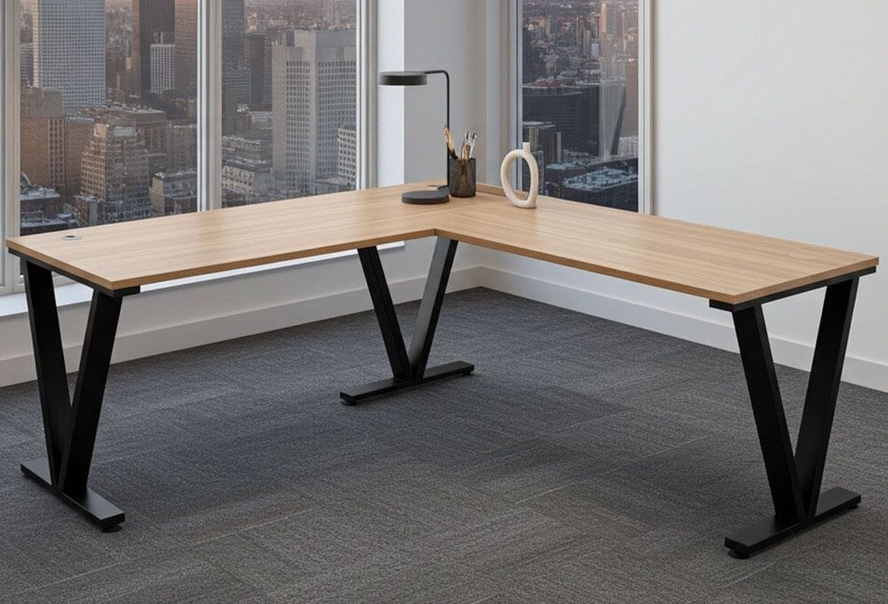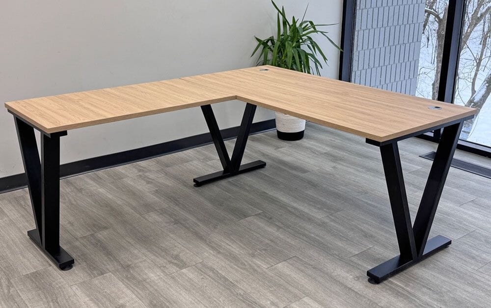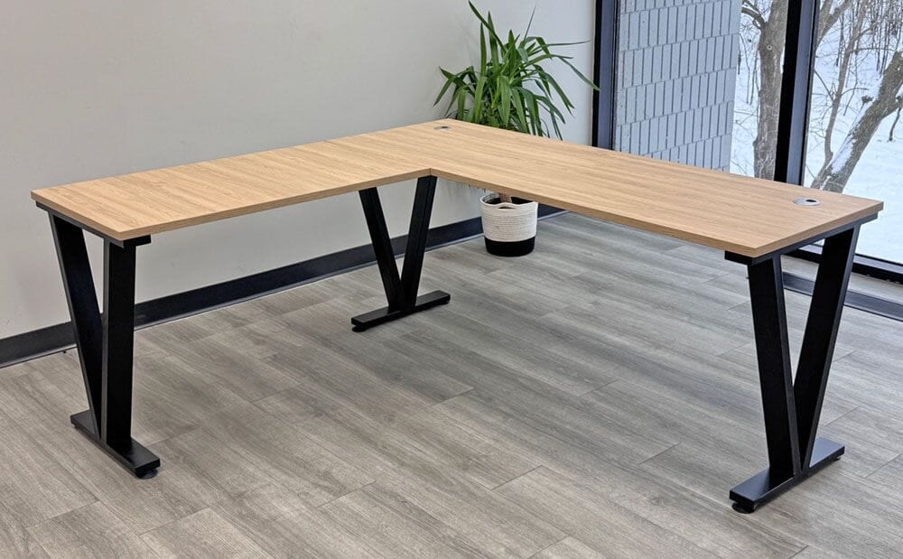 | Y14410 Just like the L-Shaped desk above but without a hutch. Desktops feature a natural laminate finish, "Beaumont Oak", that is textured and feels like real wood veneer. Black steel V-shaped desk legs. Measures 71"W x 71-1/2"D overall. Set includes a 71"W x 29-1/2”D Executive Desk and a 41" Reversible Return. Files and matching pieces sold separately below. Ships unassembled. Shpg. weight 144 lbs. PRICE INCLUDES SHIPPING! (Truck shipment - see Terms & Conditions). IN STOCK! |
