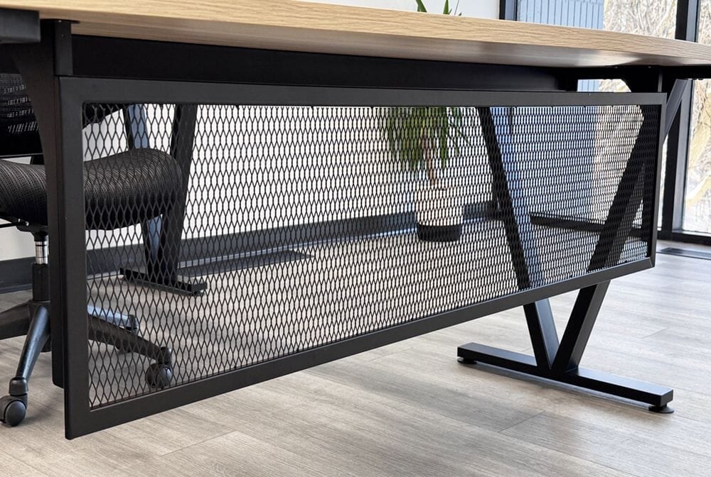 | Y14418 For use on the 63" Managers Desk. Mount under the desktop with screws. Panel measures 14-1/2"H. Hangs down 16" from the underside of desk. Black finish. Shpg. weight 8 lbs. PRICE INCLUDES SHIPPING! (Truck shipment - see Terms & Conditions). IN STOCK! |