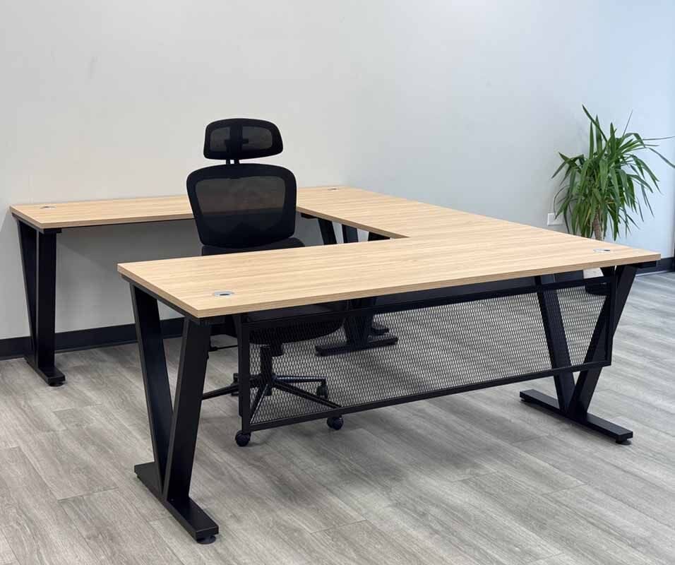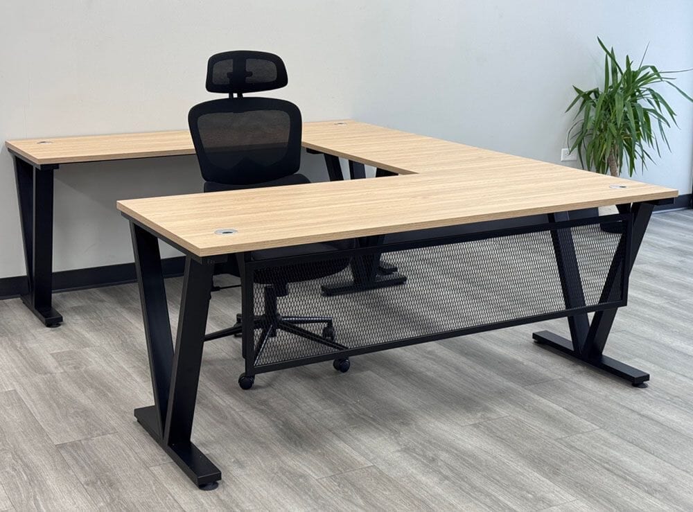 | Y14413 Just like the workstation above but without a hutch. Desktops feature a natural laminate finish, "Beaumont Oak", that is textured and feels like real wood veneer. Black steel V-shaped desk legs. Measures 63"W x 70-1/2"D overall. Set includes a 63"W x 29-1/2"D Managers Desk and a 41" Reversible Return. Files and matching pieces sold separately below. Ships unassembled. Shpg. weight 136 lbs. PRICE INCLUDES SHIPPING! (Truck shipment - see Terms & Conditions). IN STOCK! |