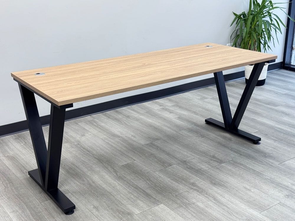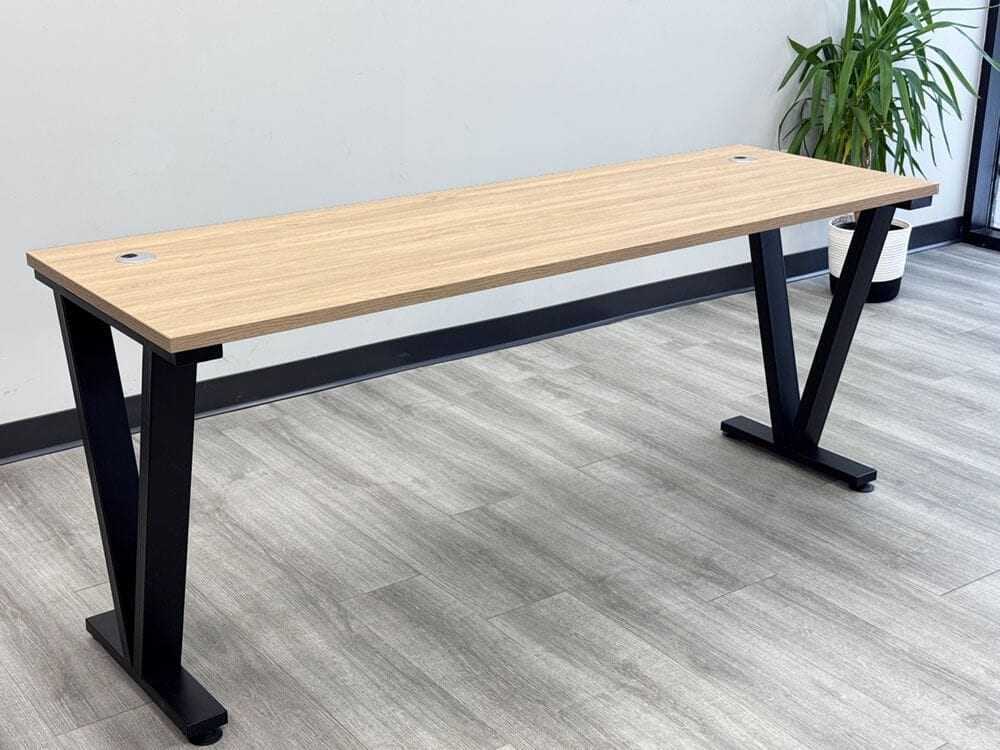 | Y14416 Desktop features a natural laminate finish, "Beaumont Oak", that is textured and feels like real wood veneer. Black steel V-shaped desk legs. Two built-in grommets for wire management. Measures 71"W x 24"D overall. Files and matching pieces sold separately below. Ships unassembled. Shpg. weight 80 lbs. PRICE INCLUDES SHIPPING! (Truck shipment - see Terms & Conditions). IN STOCK! |