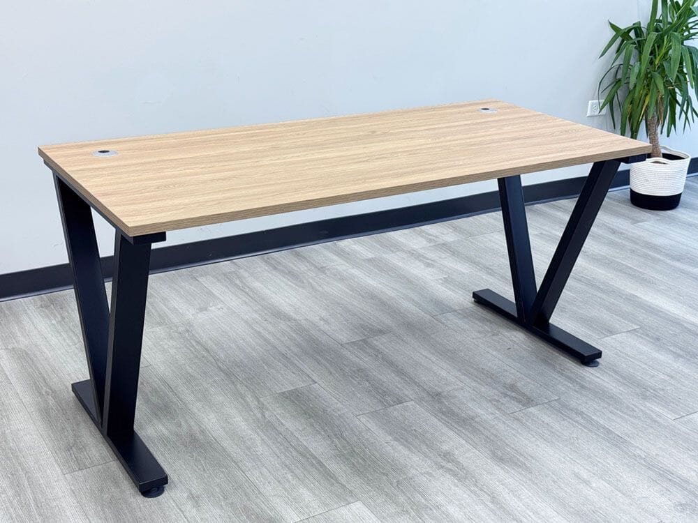 | Y14417 Desktop features a natural laminate finish, "Beaumont Oak", that is textured and feels like real wood veneer. Black steel V-shaped desk legs. Two built-in grommets for wire management. Measures 63"W x 29"D overall. Files and matching pieces sold separately below. Ships unassembled. Shpg. weight 88 lbs. PRICE INCLUDES SHIPPING! (Truck shipment - see Terms & Conditions). IN STOCK! |