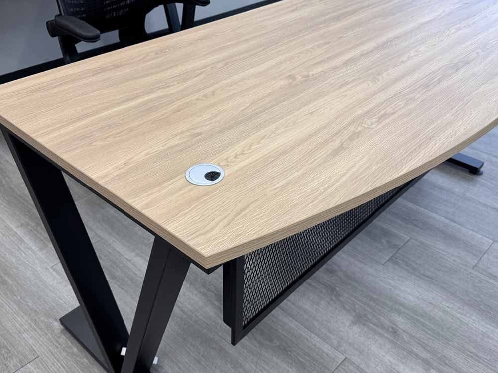 | Y14404 Just like the workstation sold above but without a hutch. The desktops feature a natural laminate finish, "Beaumont Oak", that is textured and feels like real wood veneer. Black steel V-shaped desk legs. Measures 71"W x 100-1/2"D overall. Set includes 71" Bow Front Conference Desk, 41" Reversible Bridge with Support Leg, 71" Credenza and a mesh modesty panel. Files and matching pieces sold separately below. Ships unassembled. Shpg. weight 248 lbs. PRICE INCLUDES SHIPPING! (Truck shipment - see Terms & Conditions). IN STOCK! |