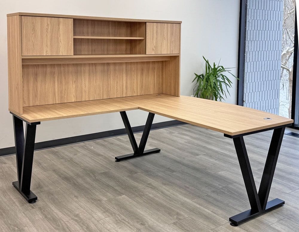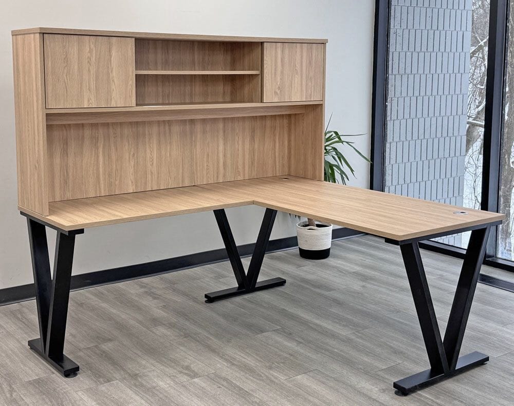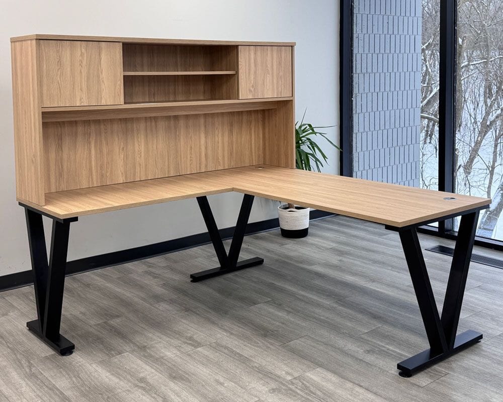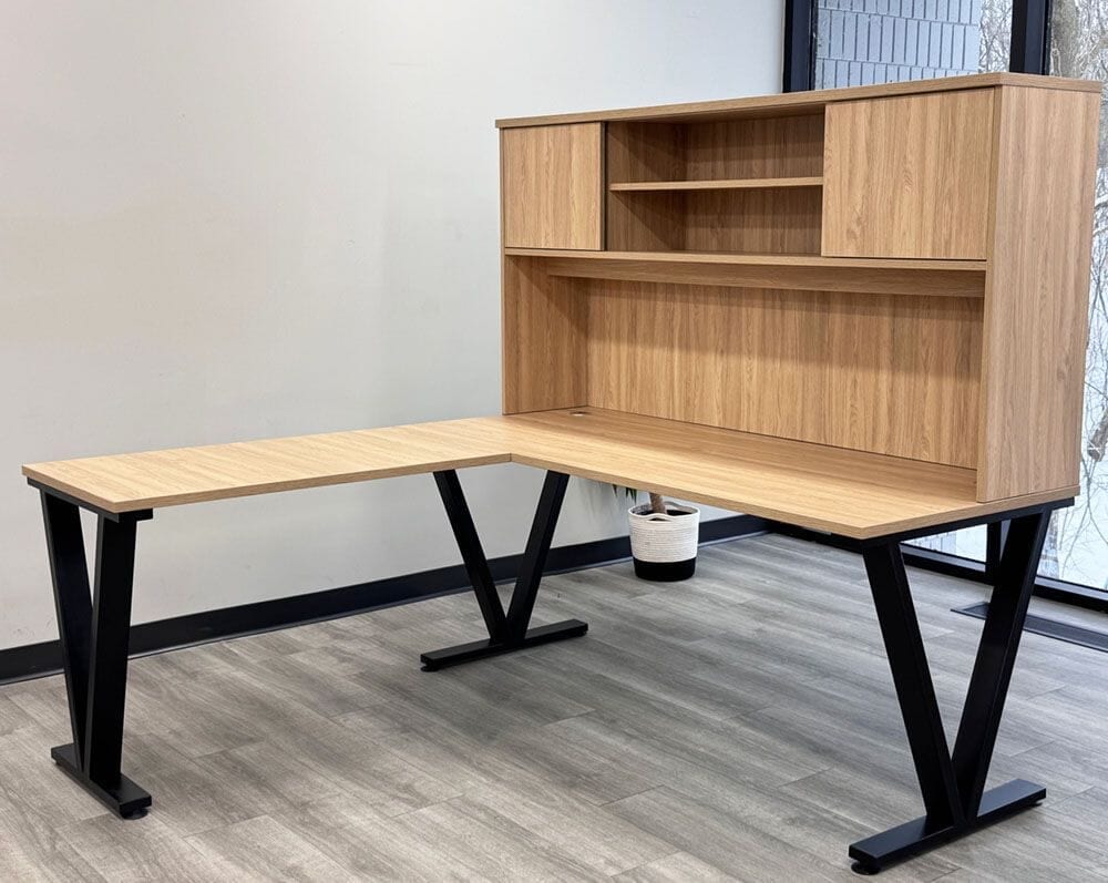 | Y14409 Desktops feature a natural laminate finish, "Beaumont Oak", that is textured and feels like real wood veneer. Black steel V-shaped desk legs. Measures 71"W x 71-1/2"D overall. Set includes a 71"W x 29-1/2”D Executive Desk, 41" Reversible Return and a 71" Hutch. Files and matching pieces sold separately below. Ships unassembled. Shpg. weight 288 lbs. PRICE INCLUDES SHIPPING! (Truck shipment - see Terms & Conditions). IN STOCK! |