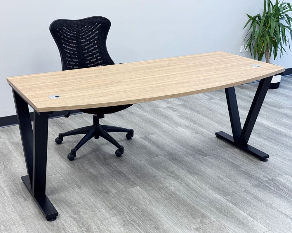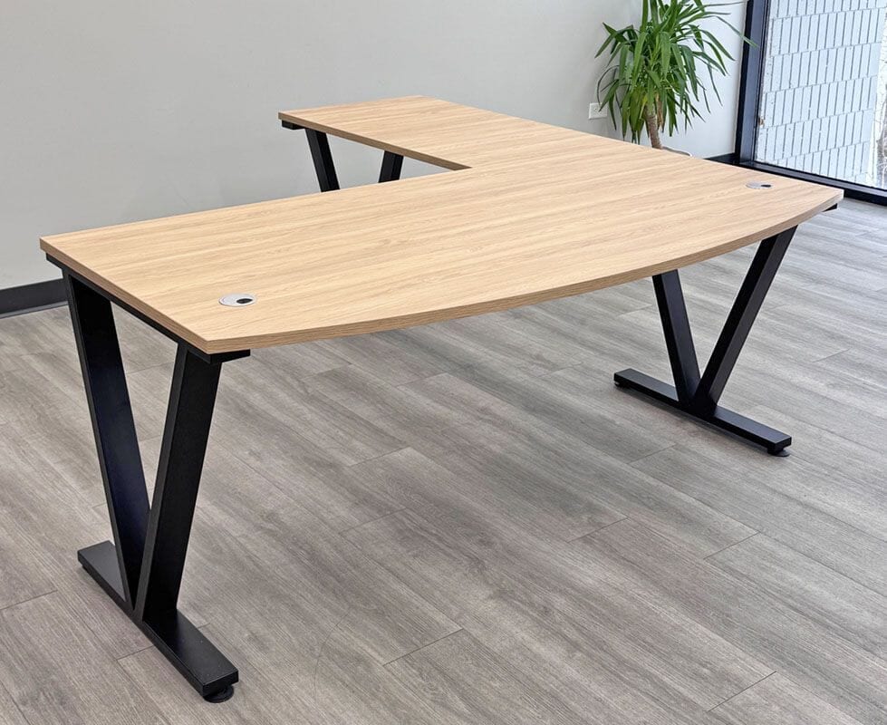 | Y14408 Just like the L-Shaped desk above but without a hutch. Desktops feature a natural laminate finish, "Beaumont Oak", that is textured and feels like real wood veneer. Black steel V-shaped desk legs. Measures 71"W x 76-3/4"D overall. Set includes a 71"W Bow Front Desk and a 41" Reversible Return. Files and matching pieces sold separately below. Ships unassembled. Shpg. weight 159 lbs. PRICE INCLUDES SHIPPING! (Truck shipment - see Terms & Conditions). IN STOCK! |