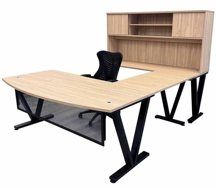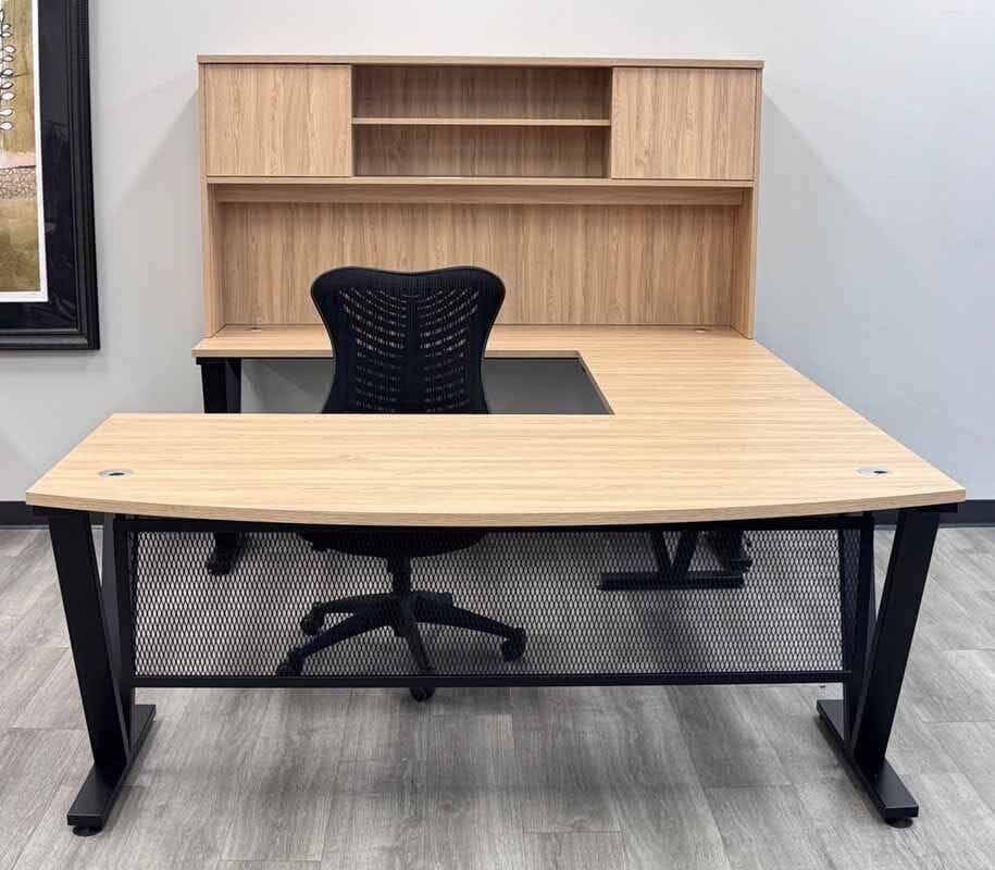 | Y14412 Desktops feature a natural laminate finish, "Beaumont Oak", that is textured and feels like real wood veneer. Black steel V-shaped desk legs. Measures 63"W x 70-1/2"D overall. Set includes a 63"W x 29-1/2"D Managers Desk, 41" Reversible Return and a 71" Hutch. Files and matching pieces sold separately below. Ships unassembled. Shpg. weight 280 lbs. PRICE INCLUDES SHIPPING! (Truck shipment - see Terms & Conditions). IN STOCK! |
