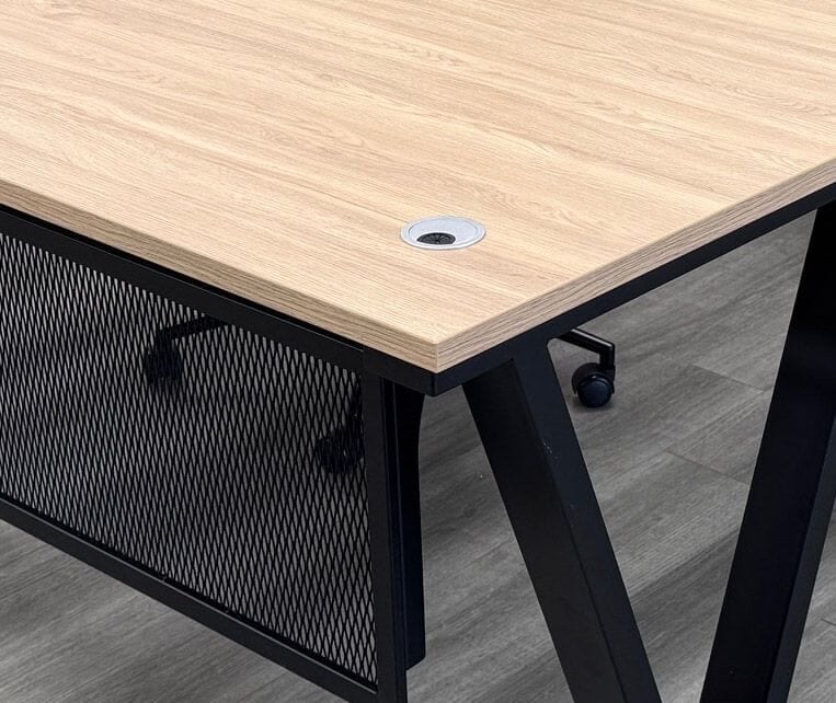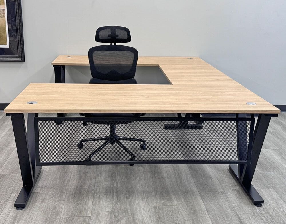 Just like the workstation above but without a hutch. The desktops feature a natural laminate finish, "Beaumont Oak", that is textured and feels like real wood veneer. Black steel V-shaped desk legs. Measures 71"W x 94-1/2"D overall. Set includes 71"W x 29-1/2"D Executive Desk, 41" Reversible Bridge with Support Leg, 71" Credenza and a mesh modesty panel. Files and matching pieces sold separately below. Ships unassembled. Shpg. weight 233 lbs. PRICE INCLUDES SHIPPING! (Truck shipment - see Terms & Conditions). IN STOCK!
