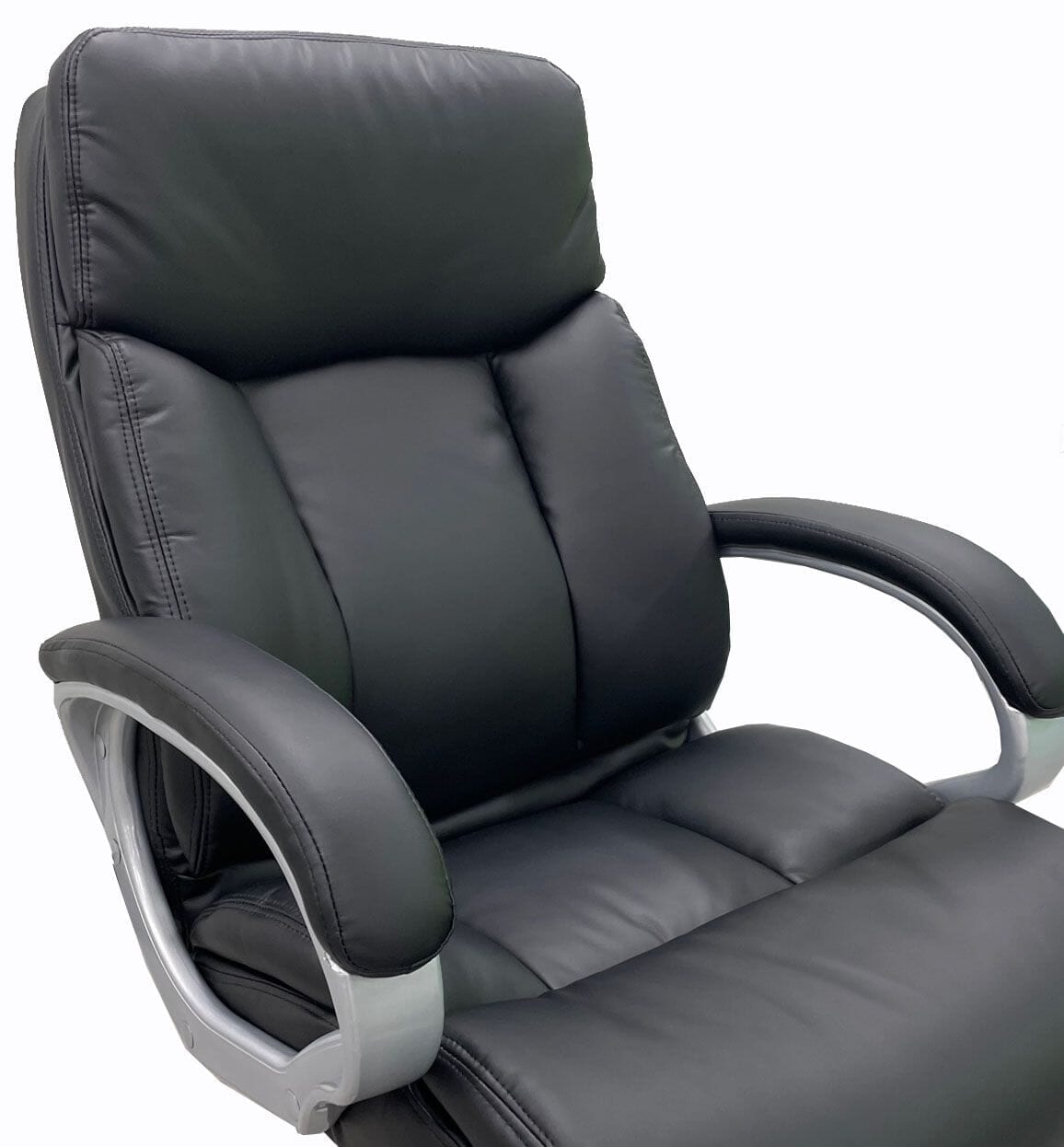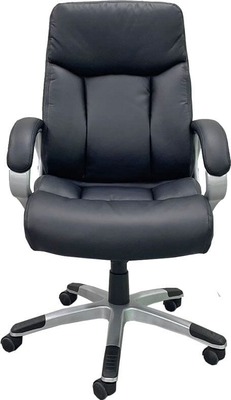 An all around comfortable, supportive office chair. Enjoy soft black bonded leather upholstery, generous padding, tufting and padded armrests for all day comfort. The silver frame adds a modern touch to a classic style chair. Features include one-touch pneumatic height adjustment, tilt with tension control and lock, swivel base and carpet casters. Whether