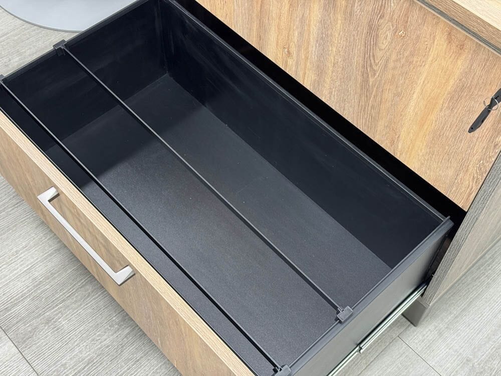 * Barn Oak laminate on top surfaces and cabinet doors. Driftwood laminate featured on shell of storage credenza return.