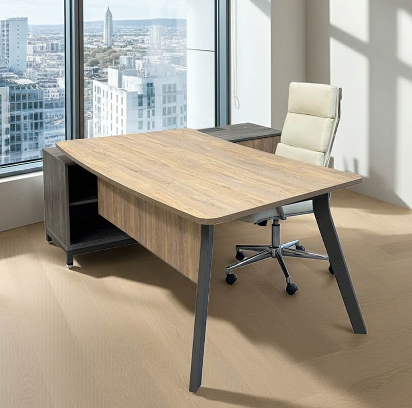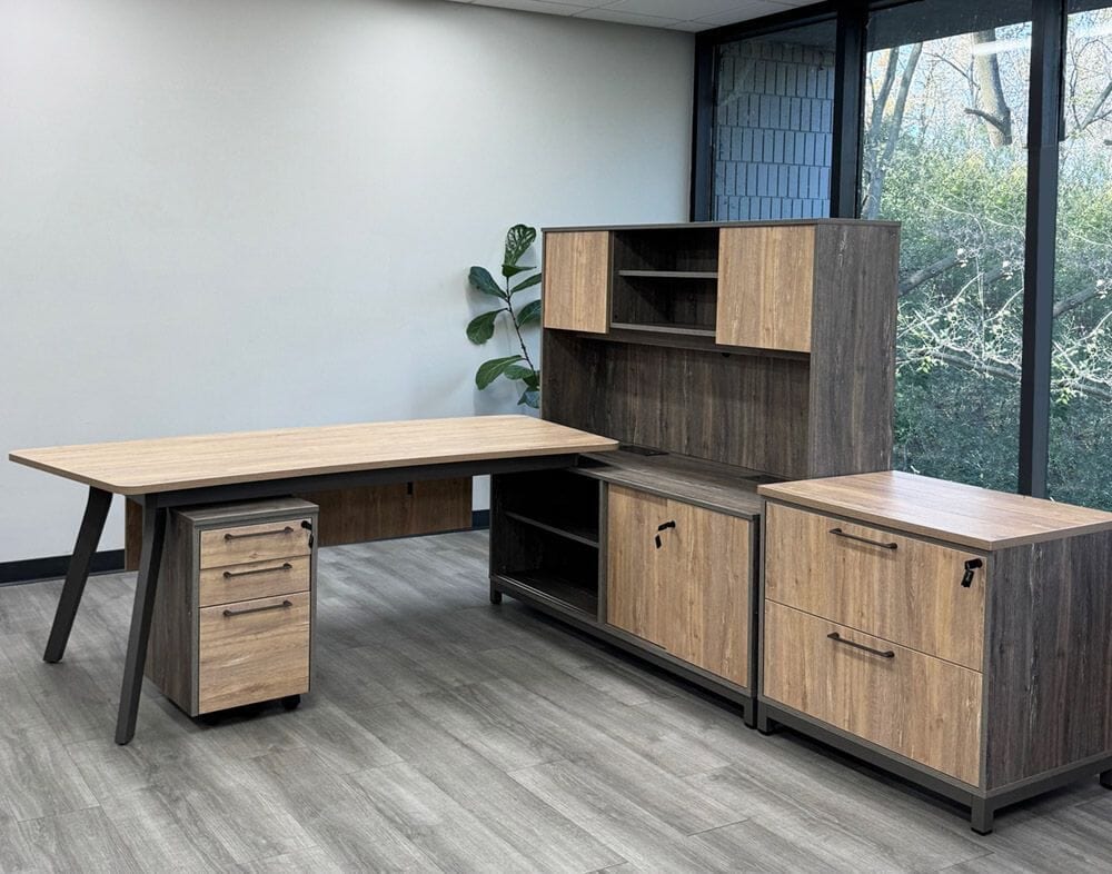 Designed for executive offices, corporate suites, and home workspaces, this modular package blends rustic warmth with contemporary sophistication. Built with commercial-grade materials and precision craftsmanship, the Contrasts Rustic 4-Piece Desk Package provides a refined, functional foundation that enhances productivity and elevates any workspace.