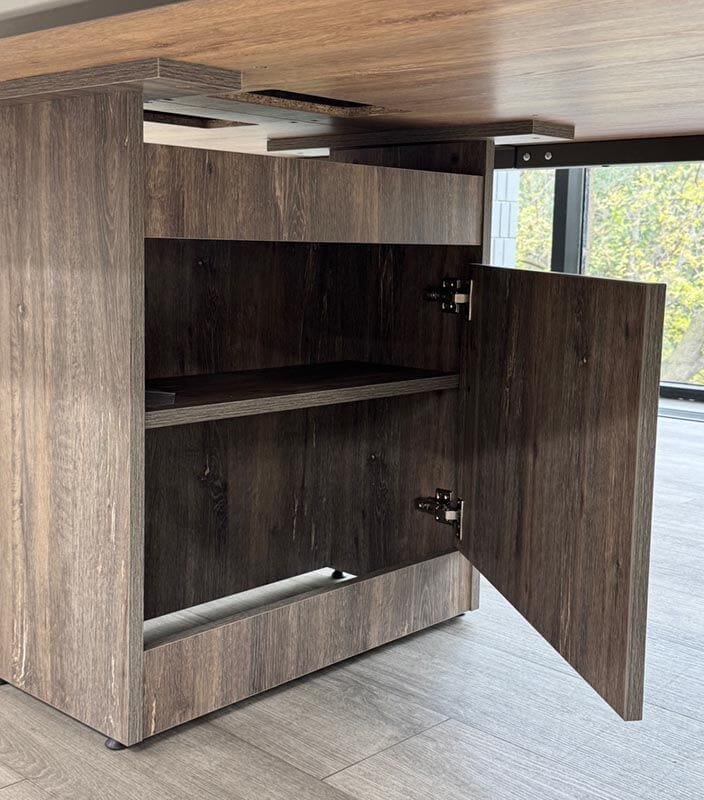 * The center pedestal allows cords to drop down from the grommets inside for concealed storage. A hinged access door makes cord management a breeze to organize.