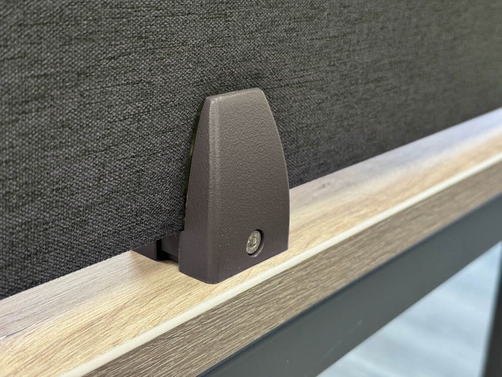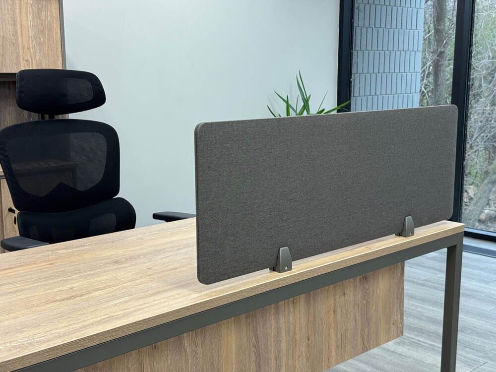 Create privacy and a convenient tackboard. Features a neutral Ash Gray fabric. Includes adjustable clamps and screws to mount to your desk surface. Measures 43-1/2"W x 15"H x 3/8"T. When installed, the partition stands 15-1/2"H over the desk top. Shipping weight 15 lbs. PRICE INCLUDES SHIPPING! IN STOCK!