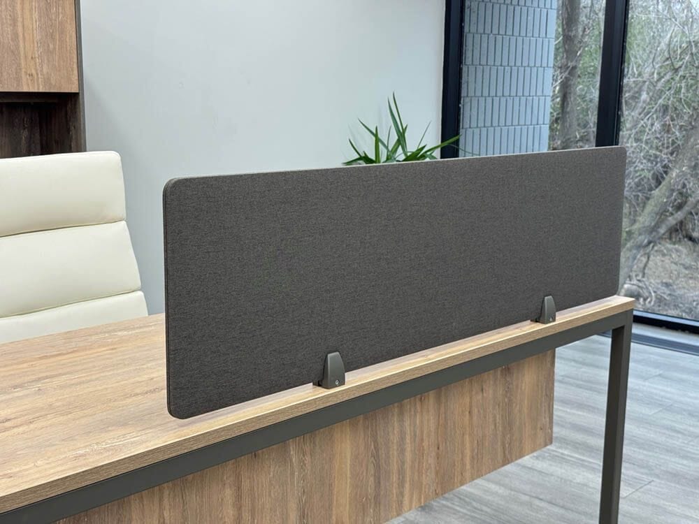 Create privacy and a convenient tackboard. Features a neutral Ash Gray fabric. Includes adjustable clamps and screws to mount to your desk surface. Measures 55"W x 15"H x 3/8"T. When installed, the partition stands 15-1/2"H over the desk top. Shipping weight 18 lbs. PRICE INCLUDES SHIPPING! IN STOCK!