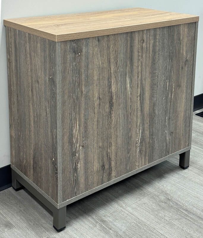 Locking cabinet features two sliding doors with an adjustable shelf inside. Features two textured woodgrain laminates: Barn Oak and Driftwood. Metal framing on cabinets ensure stability and durability. Finished on all sides. Measures 47"W x 16-1/2" x 25-1/2"H. Ships unassembled. Shipping weight 81 lbs. PRICE INCLUDES SHIPPING! IN STOCK!