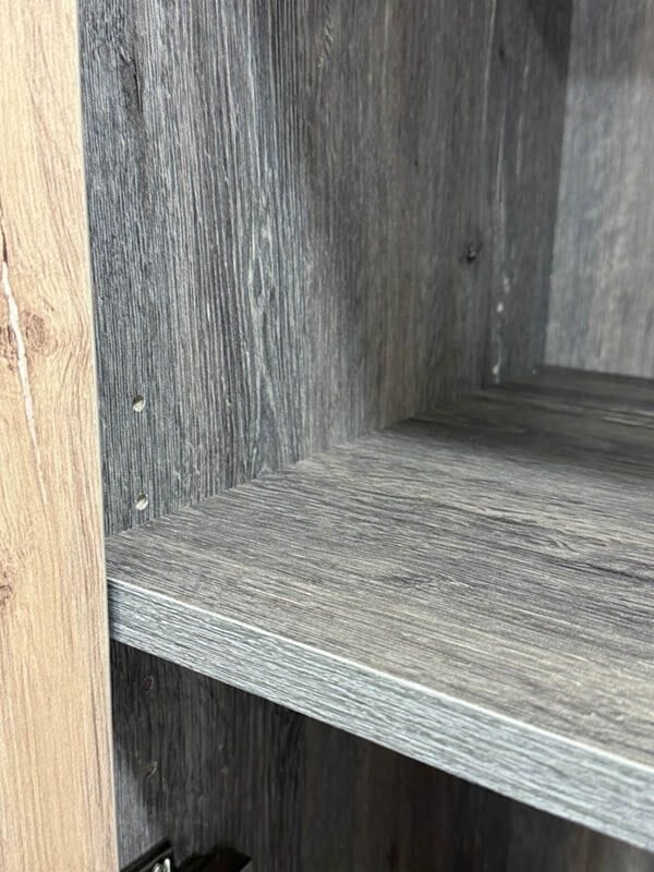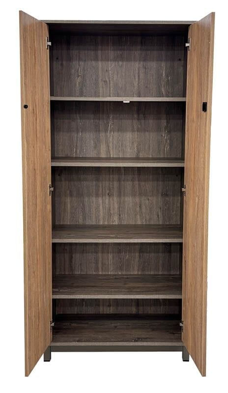 Locking cabinet features two hinged doors for storage of office supplies. Includes one fixed shelf and three adjustable shelves. Features two textured woodgrain laminates: Barn Oak and Driftwood. 8" metal door pulls feature an earthy taupe finish. Metal framing ensures stability and durability. Finished on all sides. Measures 31-1/2"W x 16-1/2" x 73-1/2"H. Ships unassembled. Shipping weight 186 lbs. PRICE INCLUDES SHIPPING! IN STOCK!