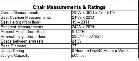 Measures 29"W x 30"D x 47-51"H overall. See other measurements below. Shpg. weight 76 lbs. All components exceed ANSI/BIFMA commercial use requirements. Meets CA fire foam approval. 5-Year Limited Warranty. Ships unassembled. PRICE INCLUDES SHIPPING! IN STOCK!