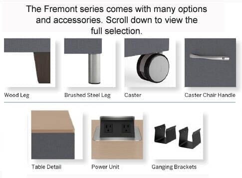 Fremont Square Table comes with a scratch-resistant, high pressure laminate top surface. Four sides of table are upholstered in the standard fabric or vinyl of your choice. Choose from tapered wooden legs or brushed stainless steel legs. Table is freestanding but can also be connected to (or between) armless chairs, with optional ganging brackets. Measures 27"W x 27"D x 14-1/2"H overall. Ships unassembled. Shpg. wt. 47 lbs. PRICE INCLUDES SHIPPING! Please allow 2-3 weeks for delivery.