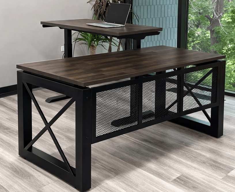 Just like the Y14150 L-Shaped Desk sold above but with an ergonomic, electric lift return desk. Includes a 66"x30" main desk (Y14148), a 48" x 24" Return Desk and a Black Electric Lift Frame. 1-1/8" thick solid hardwood desk tops are available in a variety of finishes to compliment any office space. 3" diameter welded X side legs add a touch of contemporary flair. Steel is 1.3mm thick (18 gauge). Height adjustable return raises and lowers from 24" - 50"H. Steel mesh modesty panel add to the ruggedness while providing stabilization between the side legs. The robust metal frame is finished with a black powder coat paint, providing excellent wear resistance while enhancing the overall aesthetic appeal. Optional files and power modules sold separately below. Main desk stands 29-1/2" high. Ships unassembled. Shipping weight 218 lbs. PRICE INCLUDES SHIPPING! (Truck shipment - see Terms & Conditions). IN STOCK!